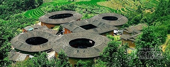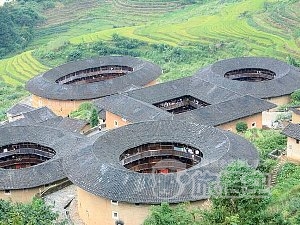 南靖県の田螺村にある、世界遺産に登録された福建土楼の1つ。この土楼群は、山の中腹の海抜800メートル近くの窪地にあり、正方形の土楼を、3つの円楼と1つの楕円楼が取り囲むように建てられています。
