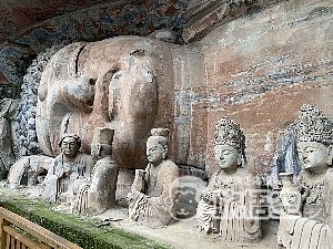 「敦煌莫高窟」、「雲岡石窟」、「龍門石窟」とともに中国を代表する石窟。唐時代から宋時代に造られた芸術性に富んだ大足石刻は、ユネスコの世界遺産に登録されています。大足石刻は中国の三大宗教である仏教、儒教、道教の三教造像群が集まる石窟として有名、大乗仏教の石刻をはじめ、儒教や道教の石刻です。9世紀末から13世紀が最盛期で仏教,道教,儒教の造像が約5万体をかぞえる。宝頂山には仏陀の入滅を描いた全長31mの釈迦涅槃像や千手観音像など,壮大なものがある。1999年世界文化遺産に登録。
