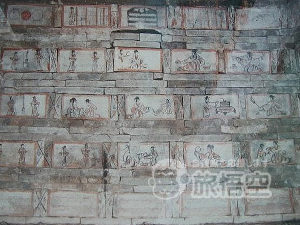 嘉峪関市から東北に20kmに位置する魏晋壁画墓は、1972年から発掘が始まり、これまでに1400あまりの墳墓が地下にあることが分かっています。しかしながら、現在観光客に開放されているのは6号墓と7号墓のニケ所のみ。その中でも年間を通じて開放されているのは6号墓だけとなっています。壁画は1500年前の当時の宮廷や庶民の生活の様子が生き生きとした筆致で描かれてます。当時を知る資料としても大変価値のある壁画です。